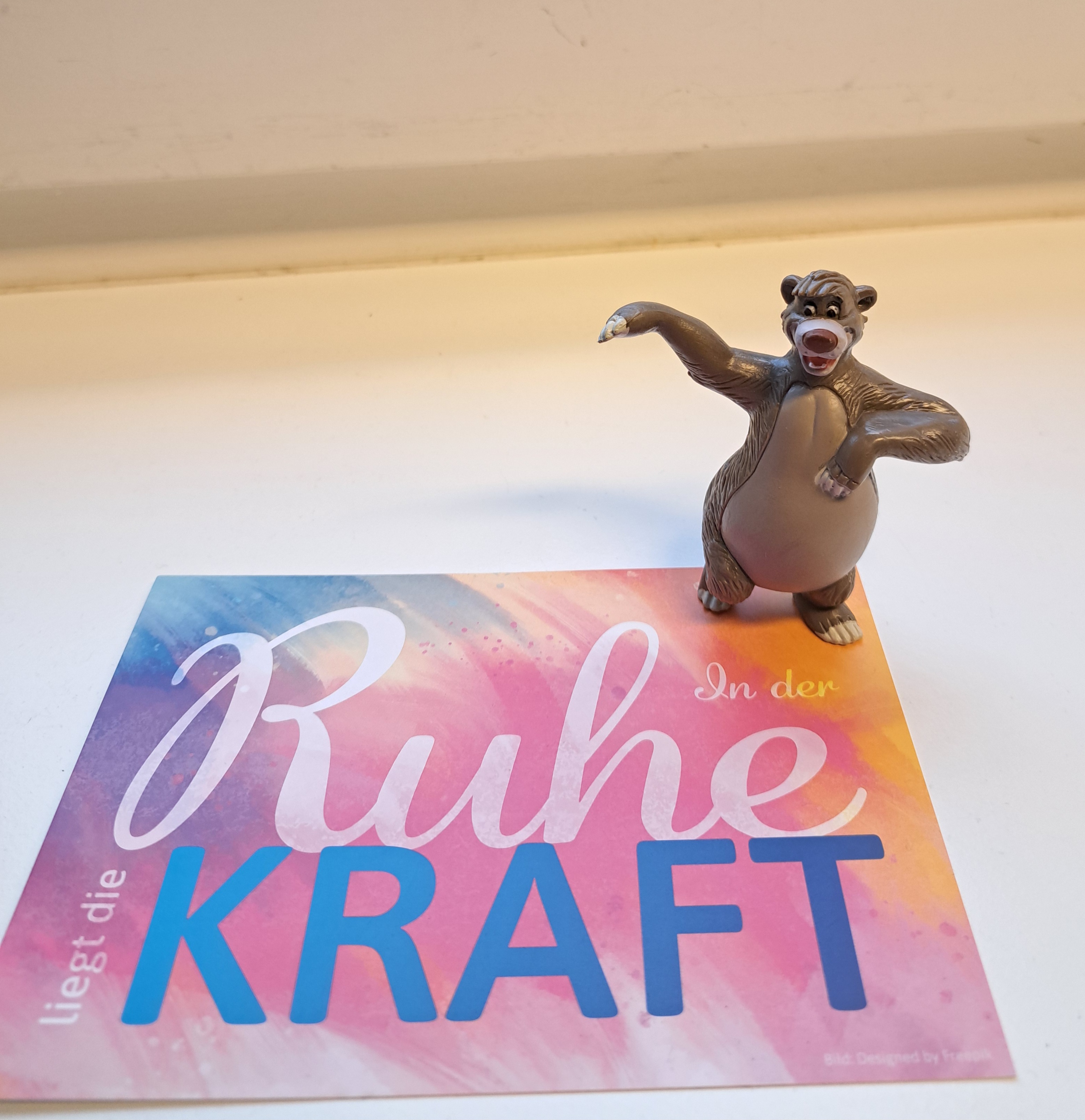 Vor vier Jahren war eine Mutter zur Kur bei uns auf Pellworm und hat im Rahmen der Stressmanagement- und Selbstfürsorgeschulung den Balu aus dem Dschungelbuch als Symbol- und Krafttier für sich gewählt. Das Ziel: Im Alltag gelassener werden.